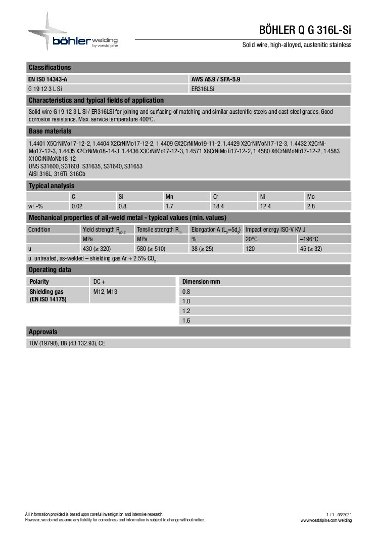 Böhler 316LSi Stainless Steel MIG Wire