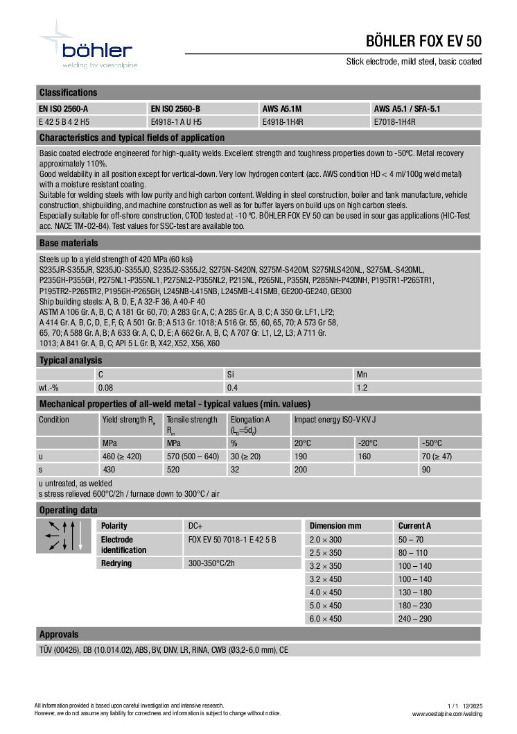 Böhler FOX EV 50 7018 Welding Electrodes