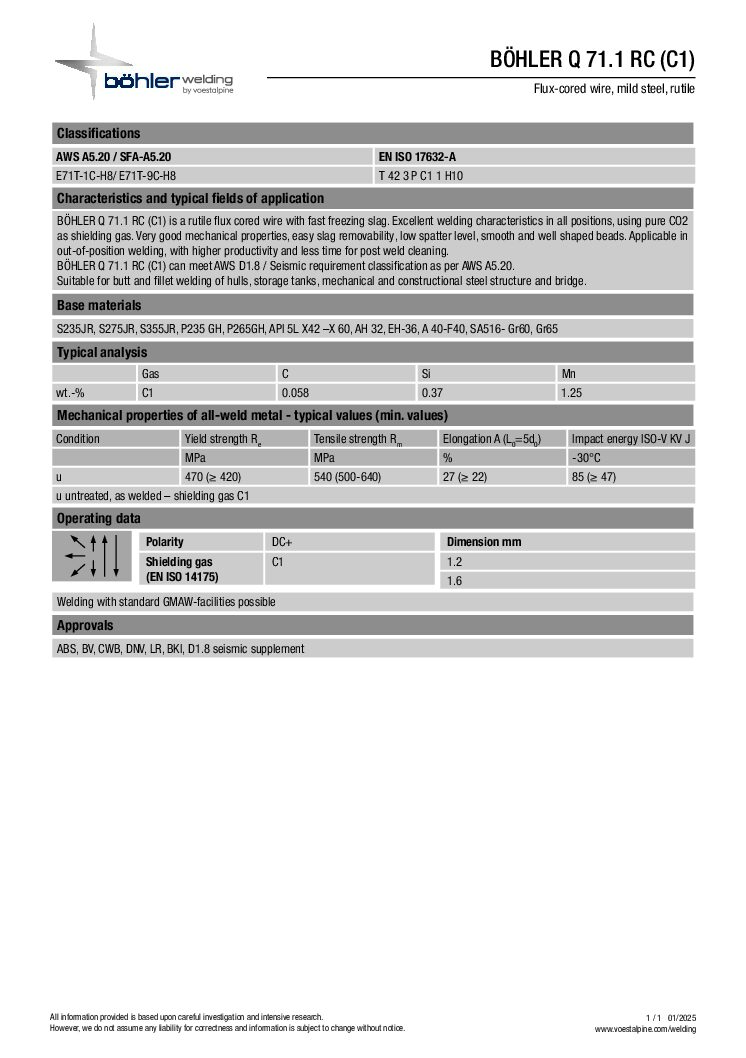 Böhler Q 71.1 RC (C1) Fluxcored MIG Wire